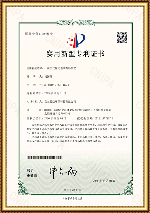 • 實用新型專利證書(一種空氣凈化通風(fēng)循環(huán)裝置